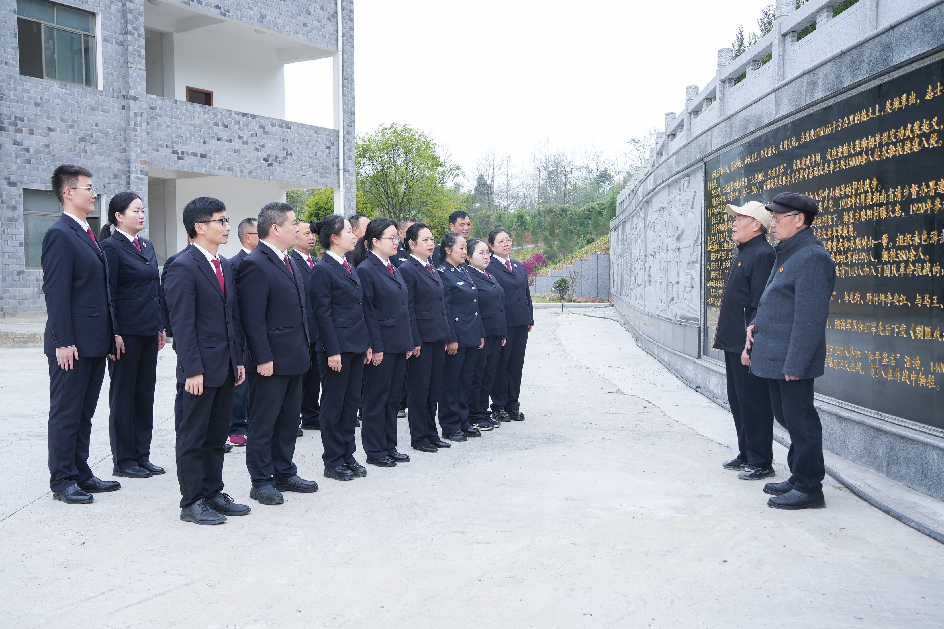干警们身着制服、队列整齐,面向革命烈士纪念碑肃立默哀,深切表达对先烈们的无限追思。随后,两名干警代表缓步向前,向烈士敬献花篮,全体人员敬献鲜花,鞠躬致敬,表达对先烈的缅怀之情。